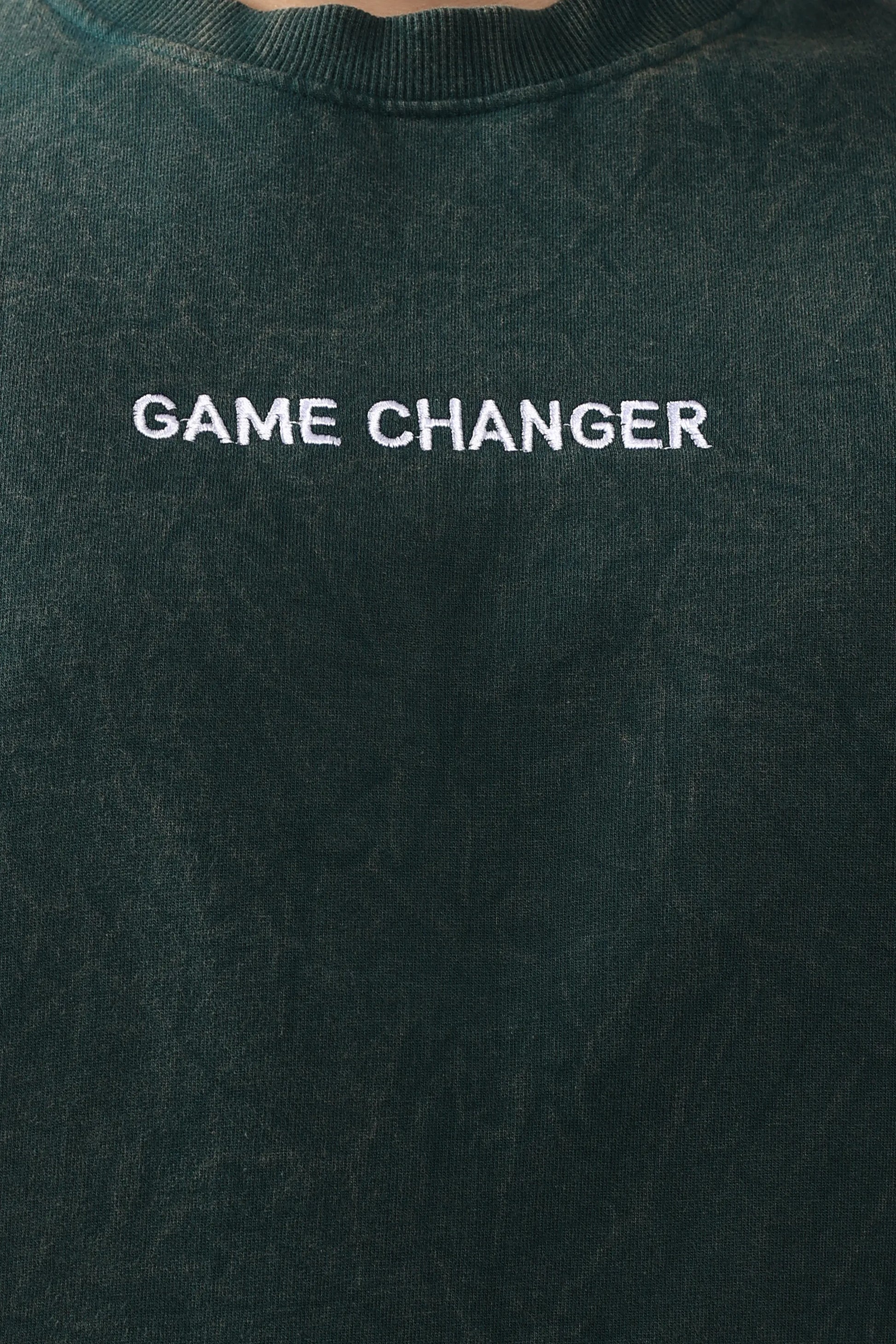 Made from premium 240 GSM French Terry cotton, this t-shirt offers an ultra-soft feel, luxury structure, and streetwear edge. The acid wash in deep green gives it a bold, rugged finish, while embroidered "GAME CHANGER" branding at the chest speaks louder than words.